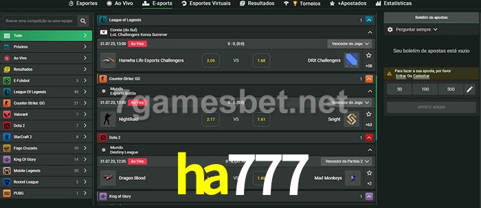O ha777 oferece uma grande seleção de opções de apostas em e-sports com probabilidades competitivas